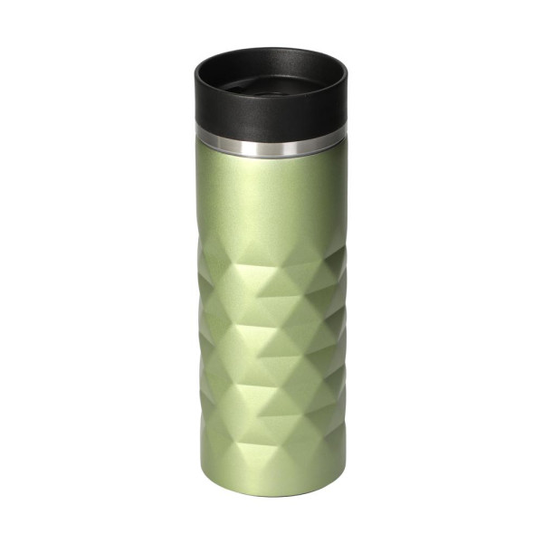 Hochwertiger Thermobecher in mattem Diamant-Design mit Glitzereffekt. Der doppelwandige Vakuumbecher aus Edelstahl verfügt über einen Deckel mit Push-Button für leichtes, einhändiges Öffnen und Schließen der Trinköffnung. Der gummierte Boden sorgt für einen sicheren Stand auch auf glatten Flächen und schützt Oberflächen vor Kratzern. Füllmenge: 0,45 Liter.
