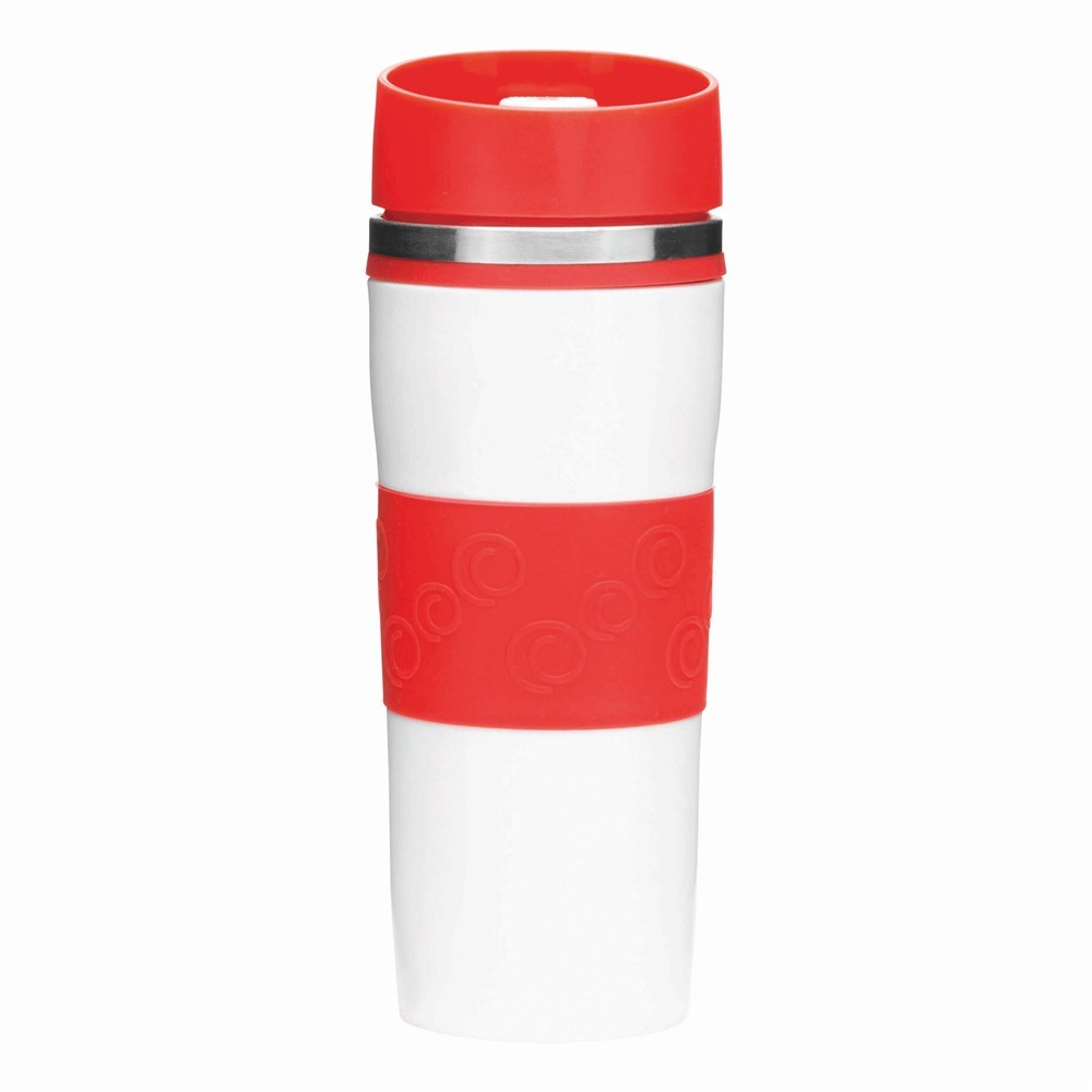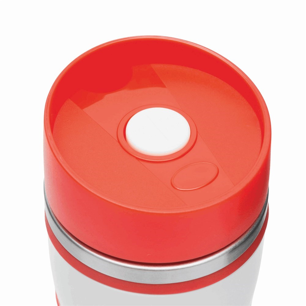 Isolierbecher ARABICA, doppelwandig: innen und außen aus Edelstahl, farbig abgesetzter Kunststoff-Deckel mit sicherem Schraubverschluss, Push-Button OPEN/CLOSE und integrierter Trinköffnung, farbige Silikon-Manschette für optimale Griffigkeit, gummierter Standfuß für gute Bodenhaftung, Füllmenge ca. 400 ml
