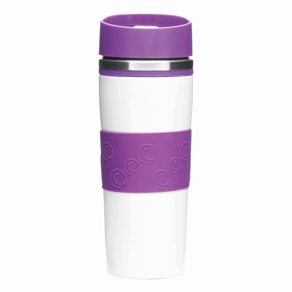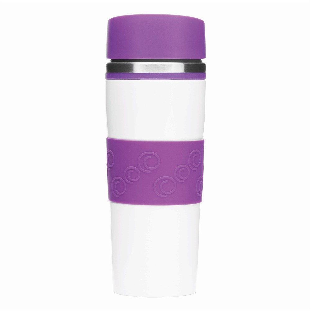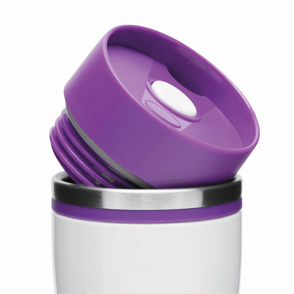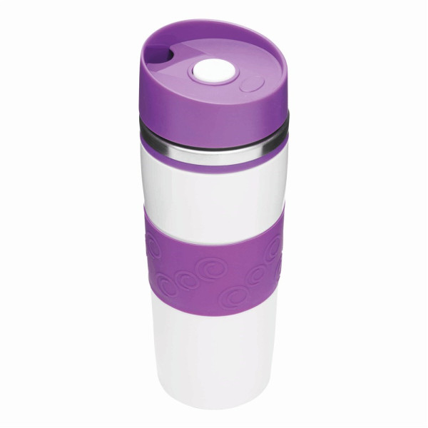 Isolierbecher ARABICA, doppelwandig: innen und außen aus Edelstahl, farbig abgesetzter Kunststoff-Deckel mit sicherem Schraubverschluss, Push-Button OPEN/CLOSE und integrierter Trinköffnung, farbige Silikon-Manschette für optimale Griffigkeit, gummierter Standfuß für gute Bodenhaftung, Füllmenge ca. 400 ml
