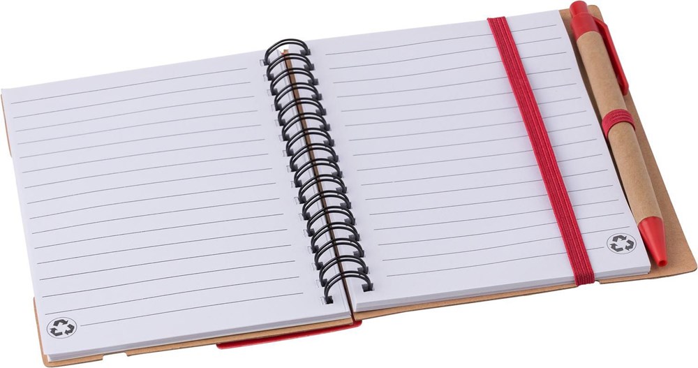 Notizbuch aus recyceltem Papier mit Ringbindung und 60 linierten Seiten. Haftnotizen in 5 Farben, Lineal und einem Rollerball.