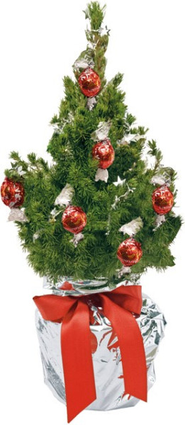 Inhalt: Bäumchen 35-45 cm geschmückt mit 8 Lindt Schoko-Kugeln (je 12,5 g), Topffolie silber, Schleife rot