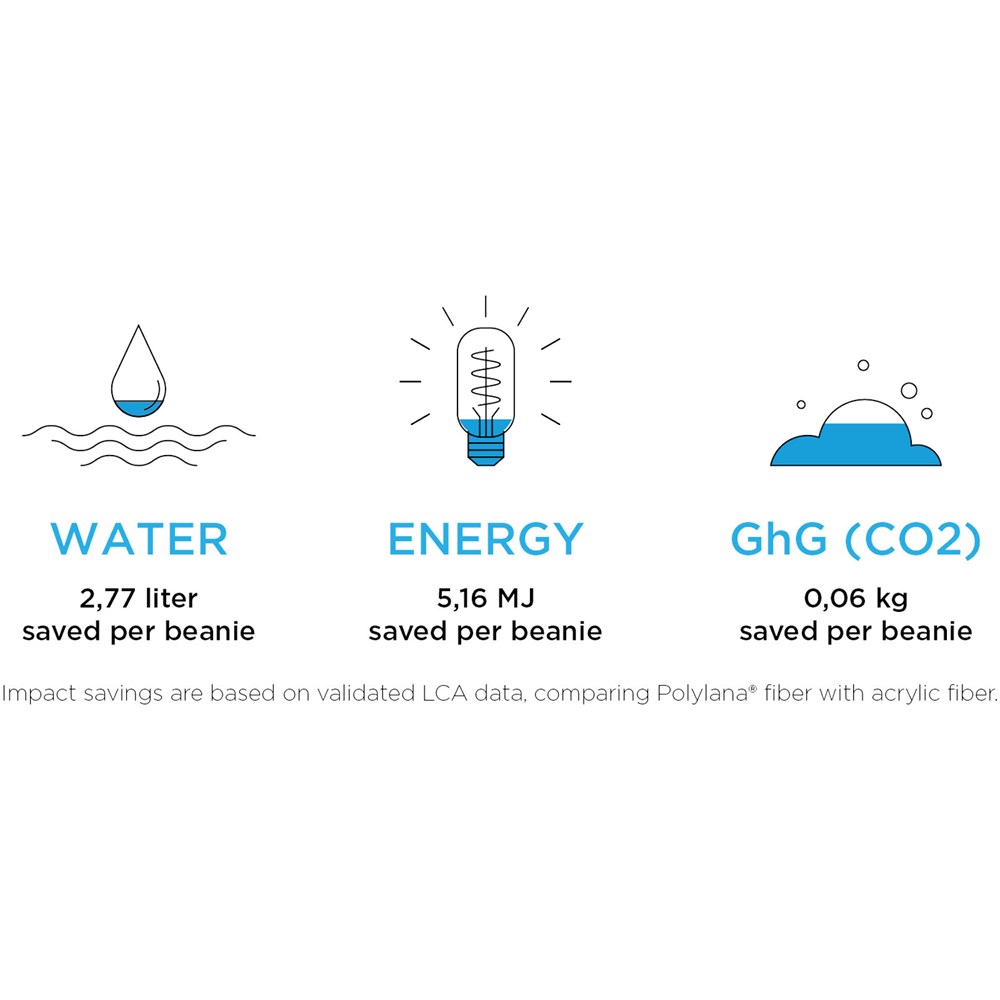 Die Hale Mütze besteht aus Polylana® Fasern - einer umweltfreundlichen Alternative zu 100% Acryl- und Wollfasern - und spart so Wasser, Energie und reduziert den CO2-Ausstoß während des Produktions- und Färbeprozesses. Im Vergleich zu Acrylfasern werden für jede Hale Mütze folgende Einsparungen erzielt: 2,77 Liter Wasser, 5,16 MJ Energie und 0,06 kg GhG (CO2). Die Einsparungen basieren auf validierten Daten der Ökobilanz (LCA). Hergestellt aus 1x1 Rippstrick mit Polylana® Fasern und Acryl mit einer Dichte von 12 Gauge. Die ideale Wahl für alle, die Wert auf Mode legen und gleichzeitig die Umwelt schonen wollen.