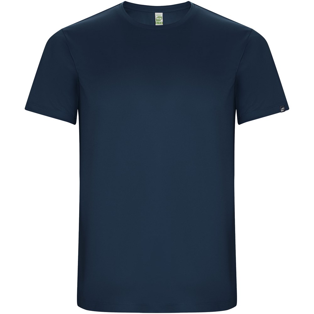 Funktions-T-Shirt aus recyceltem Polyester CONTROL DRY. Rundhalsausschnitt mit farblich abgesetzten Nähten. ECO-Logo-Etikett am Ärmel. Verpackung aus Recyclingmaterial. Herausnehmbares ECO-Etikett. Verpackung aus Recyclingmaterial. Technisches Gewebe. Das Modell ist 180 cm groß und trägt Größe M.