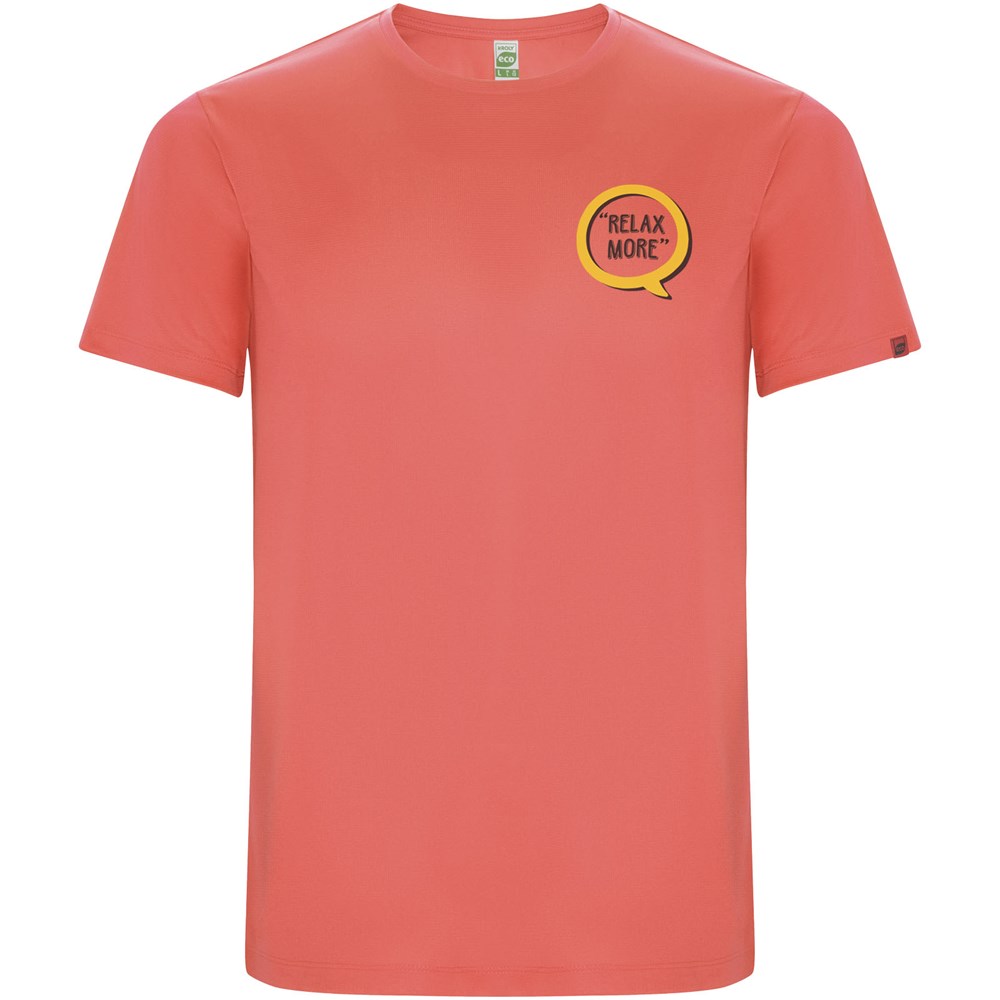 Funktions-T-Shirt aus recyceltem Polyester CONTROL DRY. Rundhalsausschnitt mit farblich abgesetzten Nähten. ECO-Logo-Etikett am Ärmel. Verpackung aus Recyclingmaterial. Herausnehmbares ECO-Etikett. Verpackung aus Recyclingmaterial. Technisches Gewebe. Das Modell ist 180 cm groß und trägt Größe M.