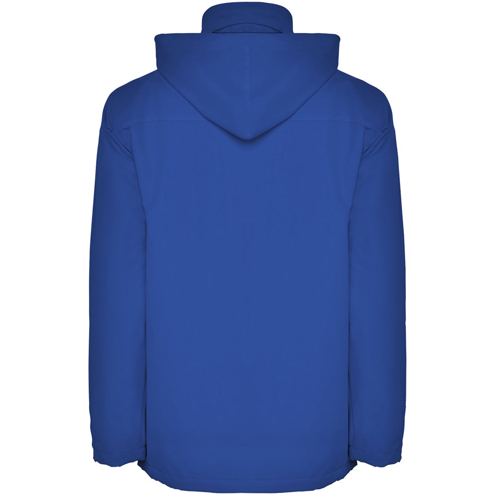 Wattierte, wasseabweisende Jacke. Zentraler Reißverschluss mit Patte. Hoher Kragen mit einrollbarer Kapuze. Seitentaschen mit Reißverschluss und Patte. Verstellbare Ärmelbündchen mit Kordelzug. Zwei Innentaschen mit Klettverschluss. Reißverschluss mit Zugang zum Innenfutter. Wasserabweisend. Winddicht. Das Modell ist 184 cm groß und trägt Größe L.