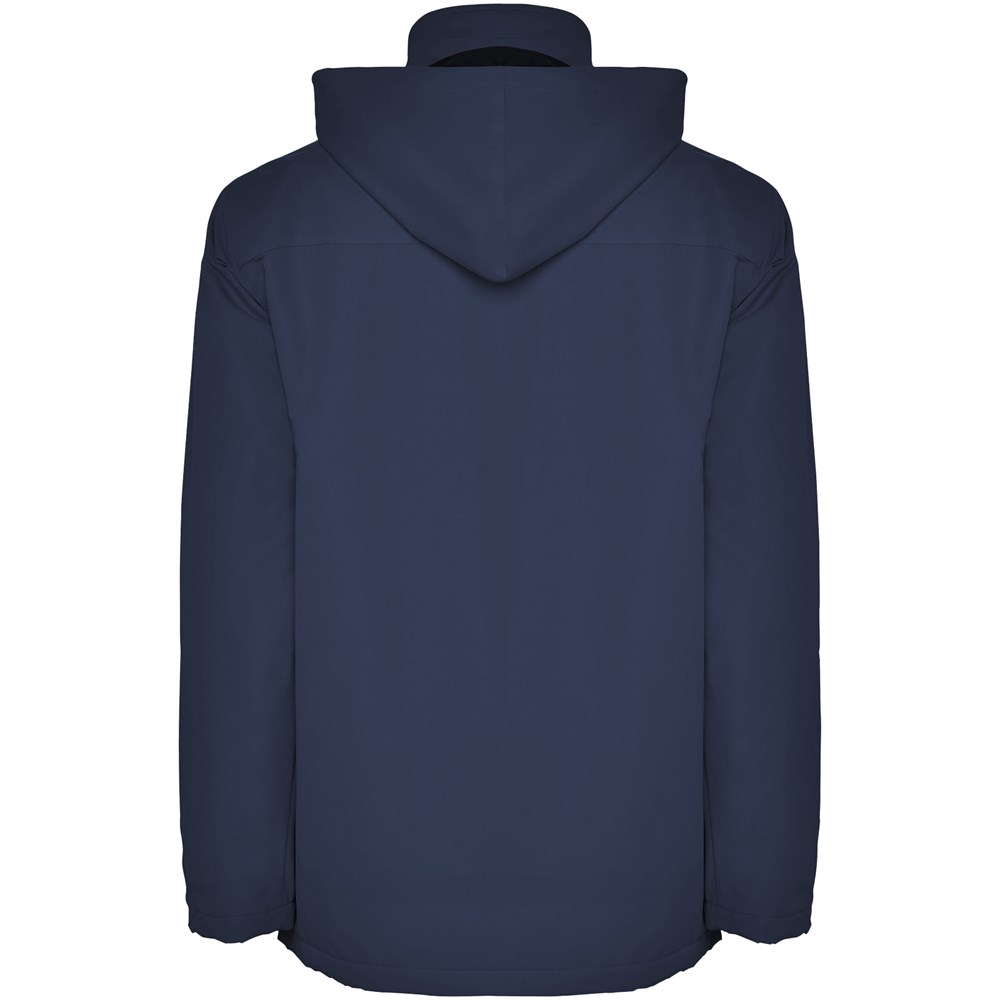 Wattierte, wasserabweisende Jacke. Zentraler Reißverschluss mit Patte. Hoher Kragen mit einrollbarer Kapuze. Seitentaschen mit Reißverschluss und Patte. Verstellbare Ärmelbündchen mit Kordelzug. Zwei Innentaschen mit Haken- und Schlaufenverschluss. Reißverschluss mit Zugang zum Innenfutter. Kindergrößen erhältlich. Wasserabweisend. Winddicht. Die Modells sind 120/122 cm groß und tragen Größe 6.