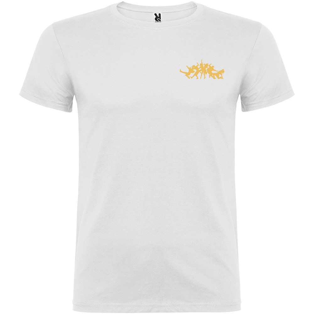 Kurzärmeliges T-Shirt mit doppellagigem Rundhalsausschnitt aus Elasthan, hergestellt aus schlauchförmigem Material. Verstärkte und verdeckte Nähte am Kragen. Herausnehmbares Etikett. Das Modell ist 120 cm groß und trägt Größe 5/6.