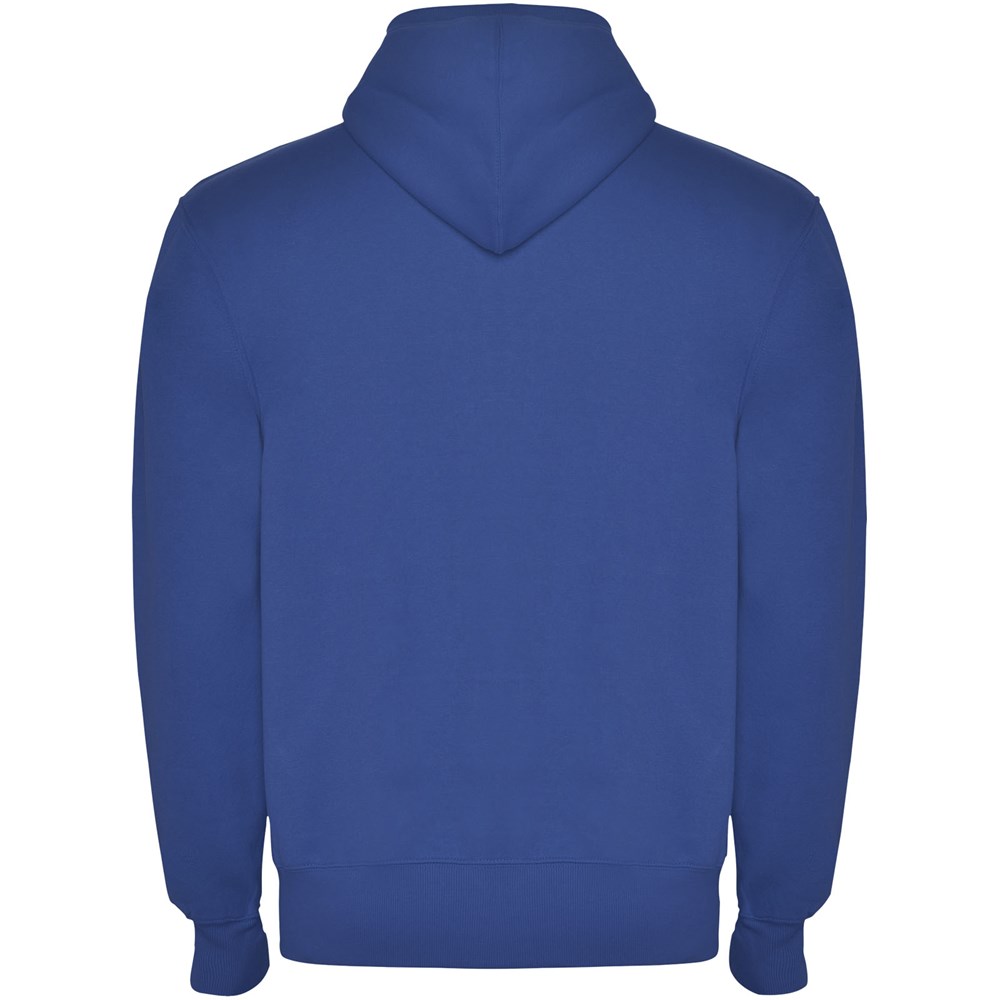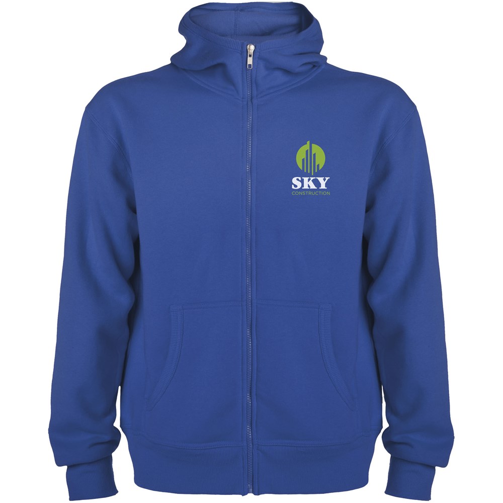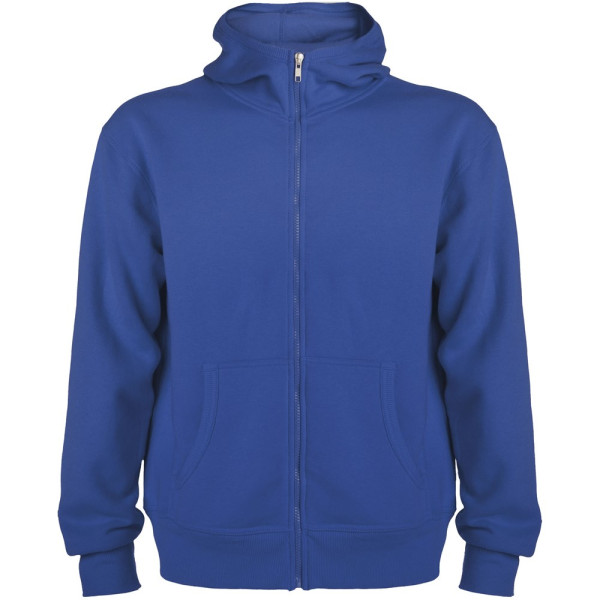 Sweatjacke mit Kapuze, hohem Halsausschnitt und durchgehendem Reißverschluss. Gerippte Details an Kapuze und Taschenpaspeln. Tasche im Känguru-Stil. 2×2 Rippenstrick an Ärmeln und Taille. Herausnehmbares Etikett. Das Modell ist 184 cm groß und trägt Größe L.