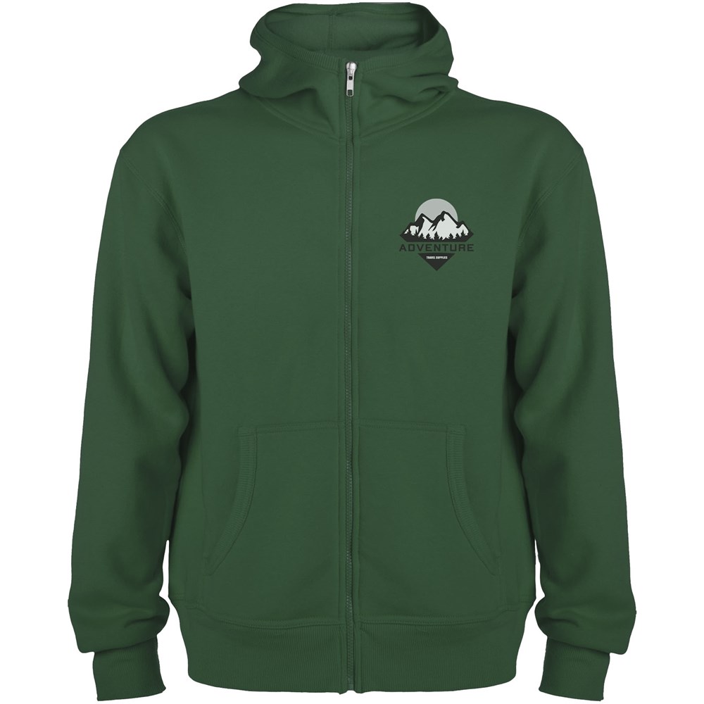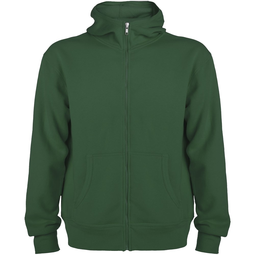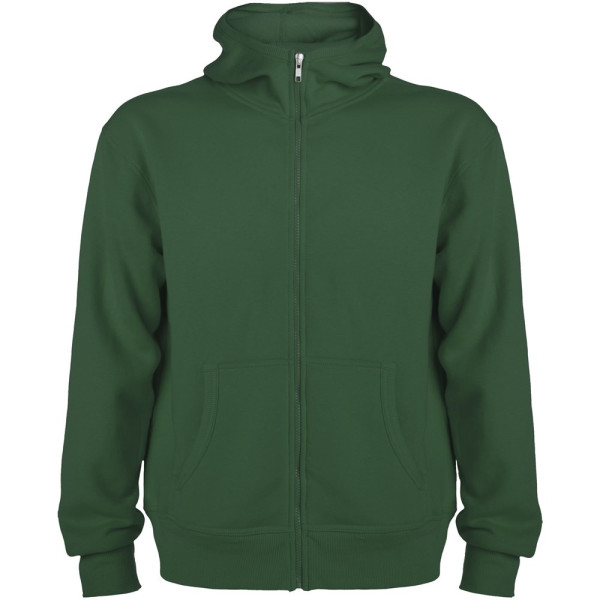 Sweatjacke mit Kapuze, hohem Halsausschnitt und durchgehendem Reißverschluss. Gerippte Details an Kapuze und Taschenpaspeln. Tasche im Känguru-Stil. 2×2 Rippenstrick an Ärmeln und Taille. Herausnehmbares Etikett. Das Modell ist 184 cm groß und trägt Größe L.