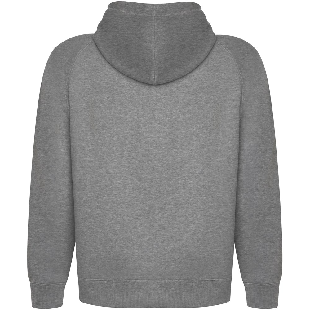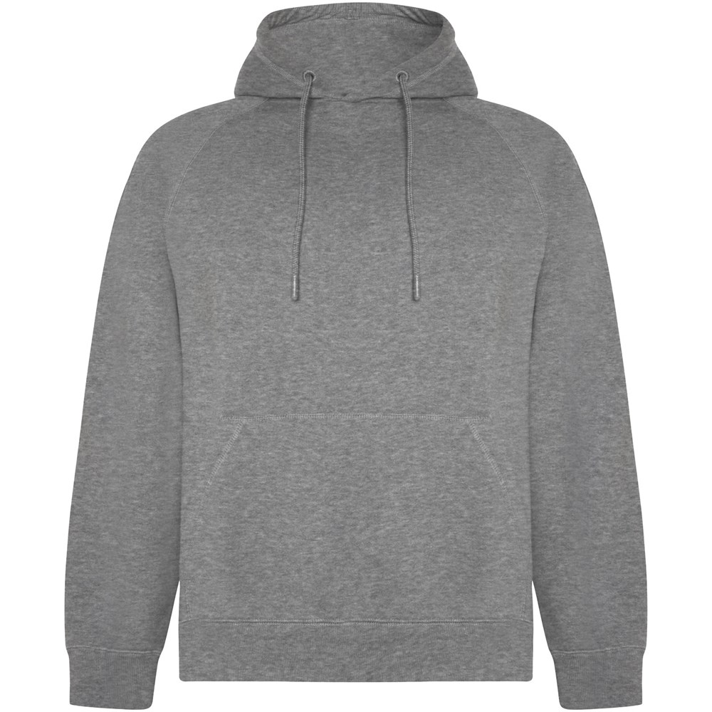 Unisex-Kapuzenpullover aus Bio-Baumwolle und recyceltem Polyester. Tasche im Känguru-Stil. Kapuze mit einfachem Jersey gefüttert. Verstellbarer Kordelzug und gestickte Ösen. Bündchen und Saum aus 2×1-Rippstrick. Herausnehmbares Etikett. Einzelverpackung aus recyceltem Material. Das männliche Modell ist 185 cm groß und trägt Größe L, das weibliche Modell ist 168 cm groß und trägt Größe S.