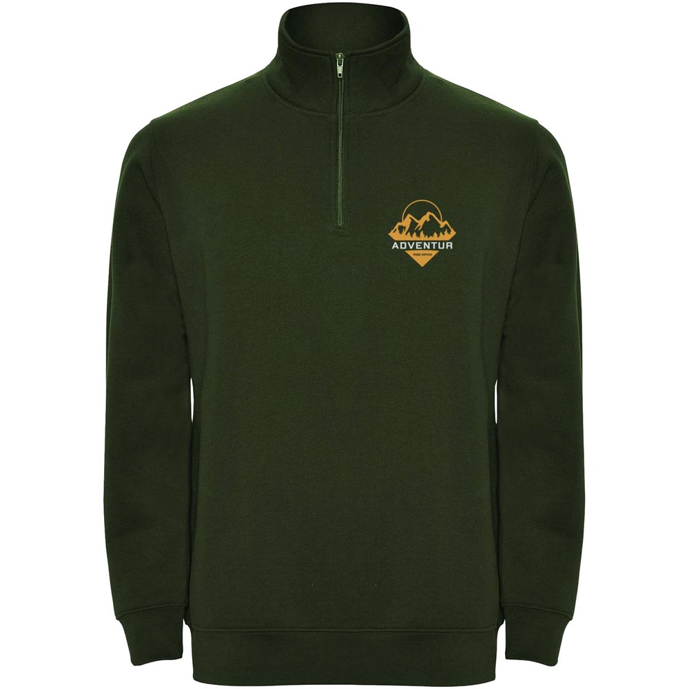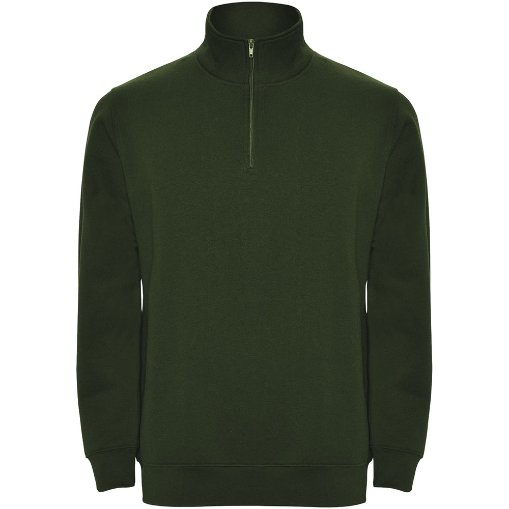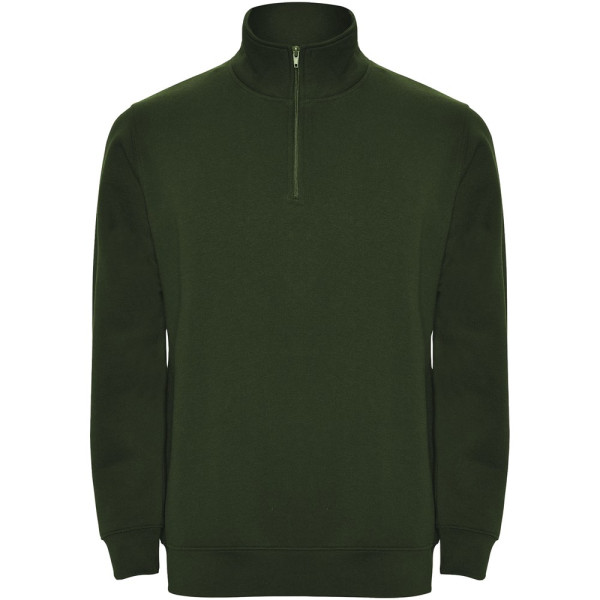 Sweatshirt mit passendem halben Reißverschluss und Polokragen. Passender Innenkragen. Verstärkte, abgedeckte Nähte am Innenkragen. 1×1 Rippbündchen an Ärmeln und Taille. Das Modell ist 185 cm groß und trägt Größe M.