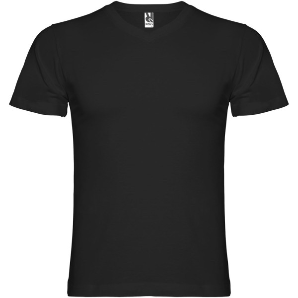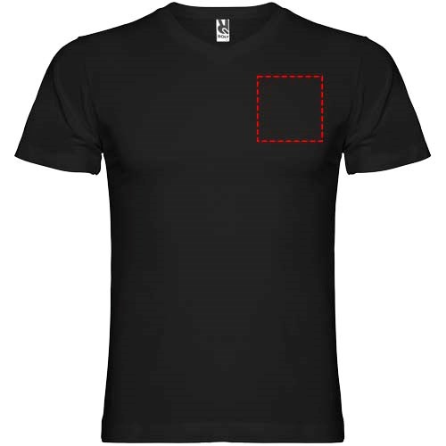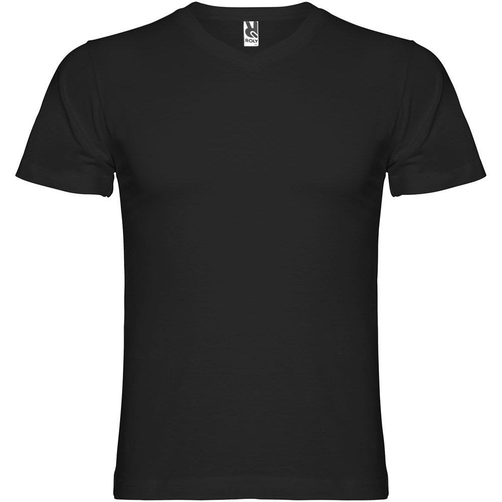 Schlauchförmiges kurzärmeliges T-Shirt mit 2-lagigem V-Ausschnitt. Verstärkte und verdeckte Nähte an Kragen und Schultern. Herausnehmbares Etikett. Das Modell ist 190 cm groß und trägt Größe L.