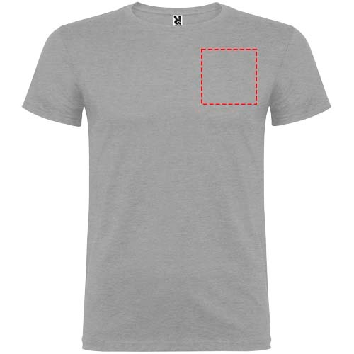 Kurzärmeliges T-Shirt mit doppellagigem Rundhalsausschnitt aus Elasthan, hergestellt aus schlauchförmigem Material für Erwachsene. Verstärkte und verdeckte Nähte am Kragen. Herausnehmbares Etikett. Das Modell ist 190 cm groß und trägt Größe L.