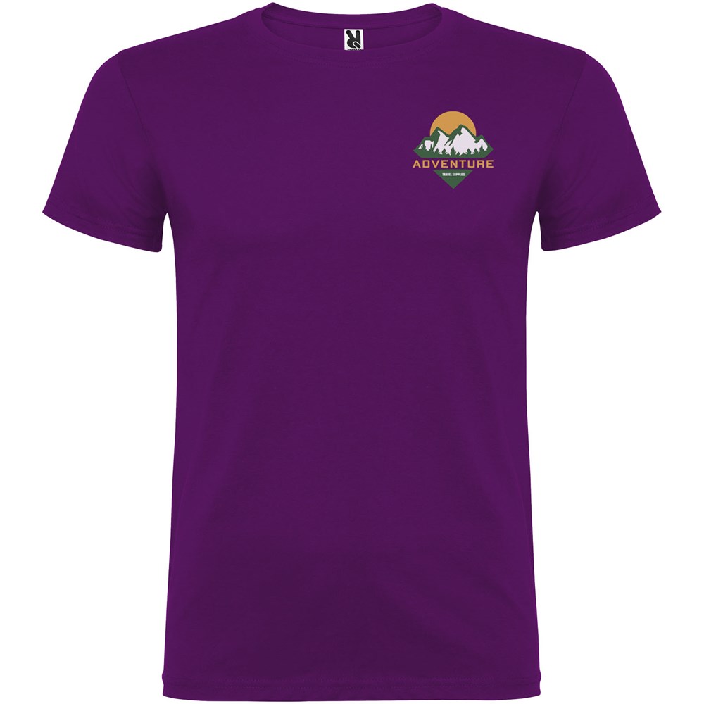 Kurzärmeliges T-Shirt mit doppellagigem Rundhalsausschnitt aus Elasthan, hergestellt aus schlauchförmigem Material für Erwachsene. Verstärkte und verdeckte Nähte am Kragen. Herausnehmbares Etikett. Das Modell ist 190 cm groß und trägt Größe L.