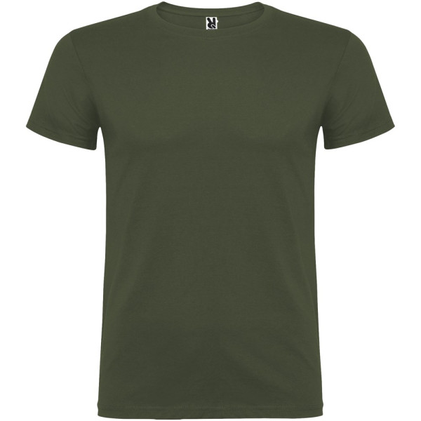 Kurzärmeliges T-Shirt mit doppellagigem Rundhalsausschnitt aus Elasthan, hergestellt aus schlauchförmigem Material für Erwachsene. Verstärkte und verdeckte Nähte am Kragen. Herausnehmbares Etikett. Das Modell ist 190 cm groß und trägt Größe L.