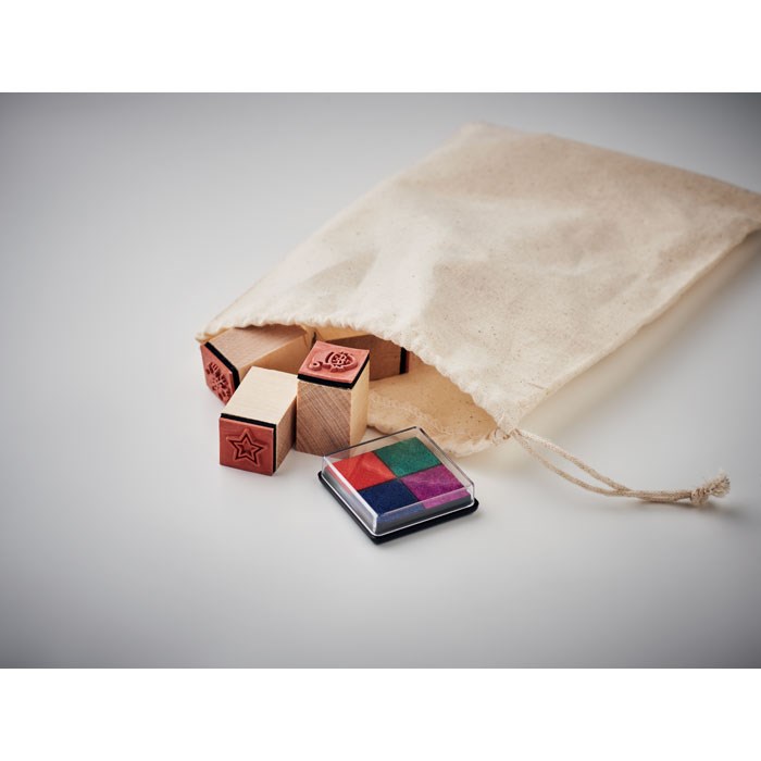 Set mit 8 Stempeln aus Holz mit weihnachtlichen Motiven und 4-farbigem Stempelkissen. Lieferung im Baumwollbeutel mit Kordelzug.