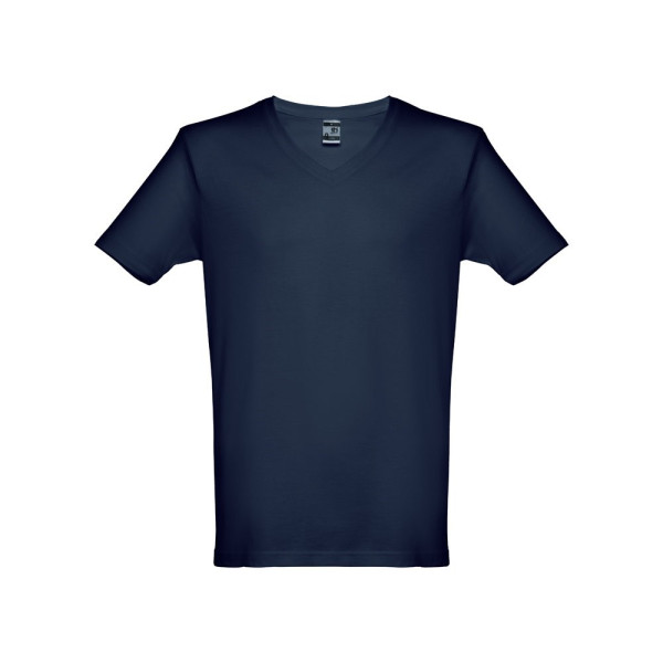 Herren T-Shirt aus 100% Strickjersey und Baumwolle (150g/m²) mit kardiertem Baumwollfaden in Tubular-Form, mit V-Ausschnitt, Verstärkungsband, Jersey-Kragen und Doppelnaht an Ärmeln und Saum. Bei den Farben 194, 195 und 199 bestehend aus 60% Baumwolle und 40% Polyester. Größen: S, M, L, XL, XXL