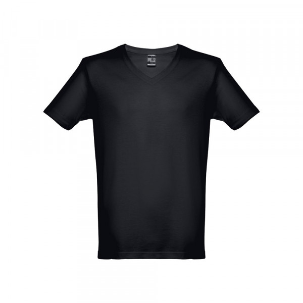 Herren T-Shirt aus 100% Strickjersey und Baumwolle (150g/m²) mit kardiertem Baumwollfaden in Tubular-Form, mit V-Ausschnitt, Verstärkungsband, Jersey-Kragen und Doppelnaht an Ärmeln und Saum. Bei den Farben 194, 195 und 199 bestehend aus 60% Baumwolle und 40% Polyester. Größen: S, M, L, XL, XXL