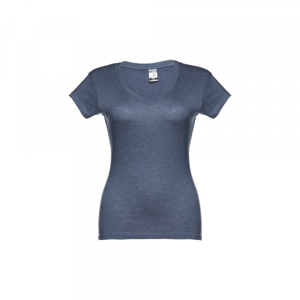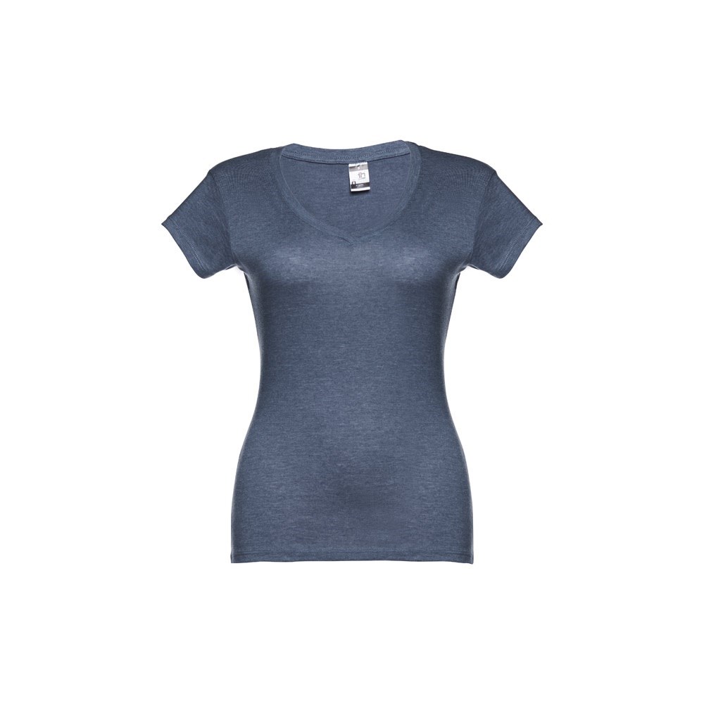 Damen T-Shirt aus 100% Strickjersey und Baumwolle (150g/m²) mit kardiertem Baumwollfaden, tailliert, überlapptem V-Ausschnitt, Verstärkungsband, Jersey-Kragen und Doppelnaht an Ärmeln und Saum. Bei den Farben 194, 195 und 199 bestehend aus 60% Baumwolle und 40% Polyester. Größen: S, M, L, XL, XXL