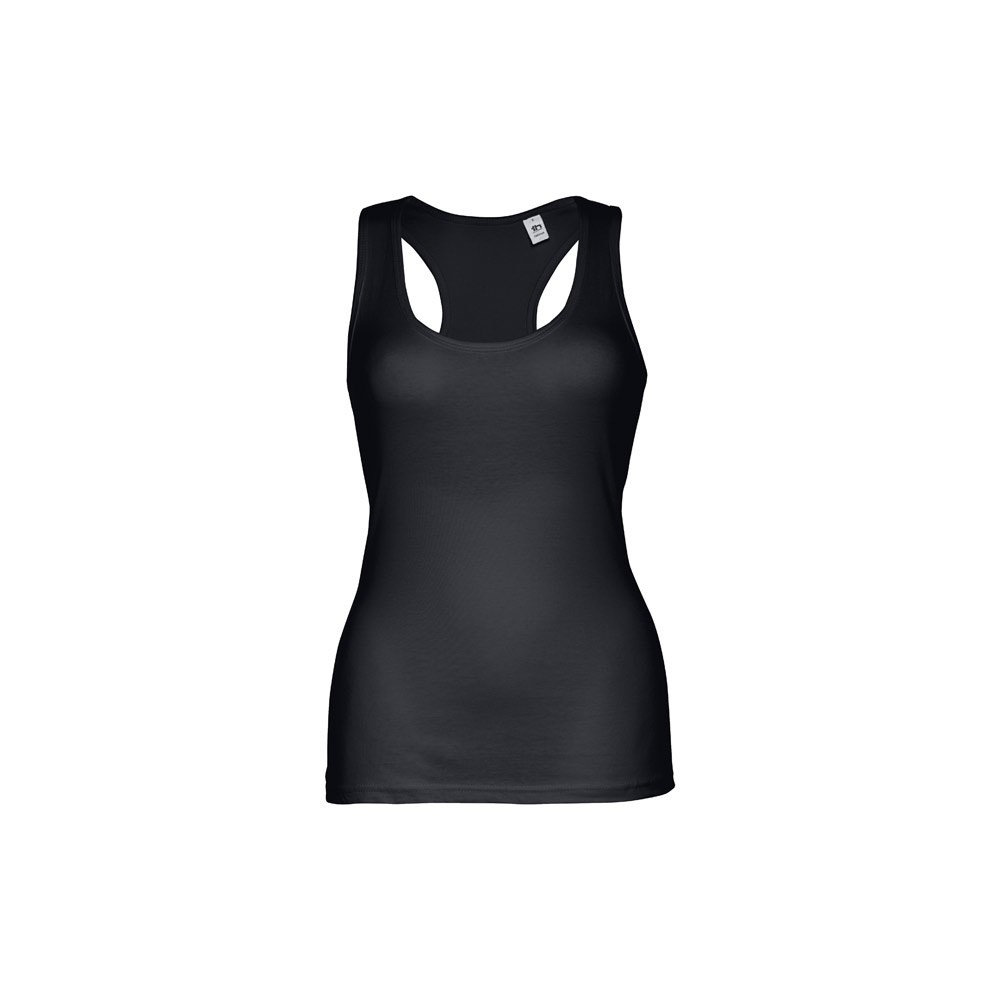 Damen Tank Top aus 100% Strickjersey und Baumwolle (160g/m²) mit kardiertem Baumwollfaden und" T"-Ausschnitt am Rücken. Doppelnaht am Saum, an den Armlöchern und Ausschnitt. Größen: S, M, L, XL, XXL