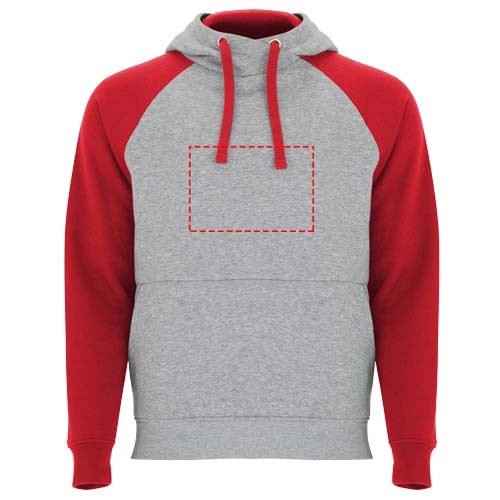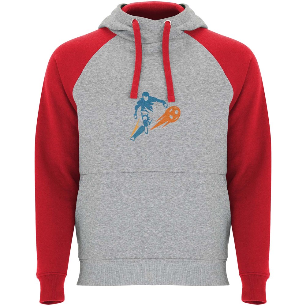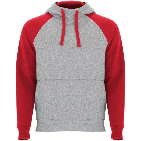Zweifarbiger Unisex Kapuzenpulli. Kapuze mit gekreuztem Kragen und Metallösen. Innenkapuze, Kordelzug und Raglanärmel in Kontrastfarbe. Kängurutasche. Bündchen und Saum aus elastischem 1×1-Rippstrick. Abnehmbares Etikett.