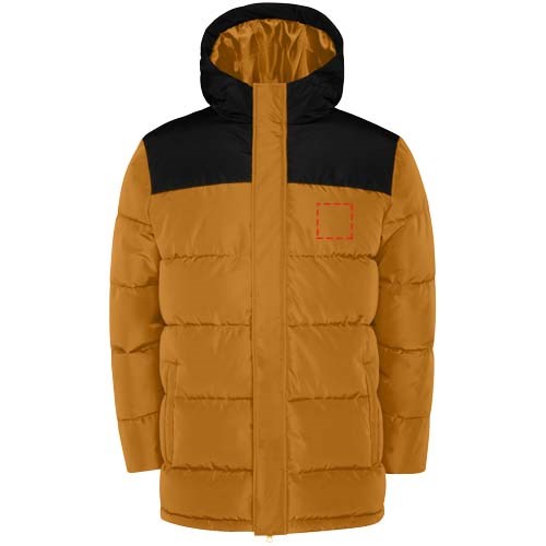 Wattierte Jacke mit fester Kapuze. Reißverschluss auf der Vorderseite, verdeckt durch eine Knopfleiste. Kinnschutz. Zwei Seitentaschen mit Reißverschluss. Elastische Bündchen.