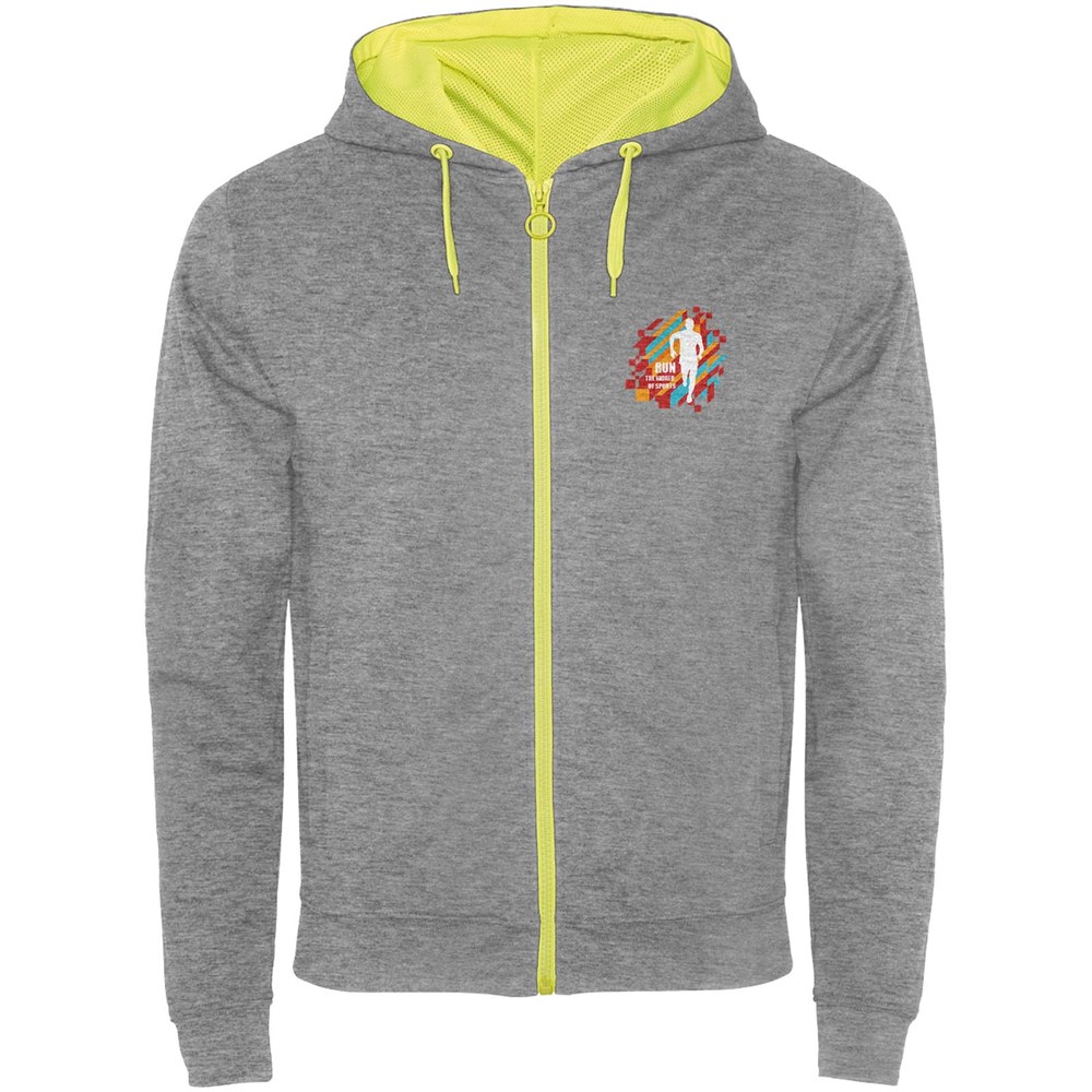 Sweatjacke aus ungebürstetem Fleece mit fluoreszierenden Verzierungen. Reißverschluss in der Mitte mit Zipper in Kontrastfarbe. Kapuze mit Innenfutter aus mikroperforiertem Polyesterstoff in fluoreszierender Kontrastfarbe. Kordelzug und Metallösen in fluoreszierender Kontrastfarbe. 1×1-Rippstrick an Bündchen und Taille. Zwei Taschen auf der Vorderseite mit breitem Saum. Verstärkte und verdeckte Nähte am Innenkragen. Abnehmbares Etikett.