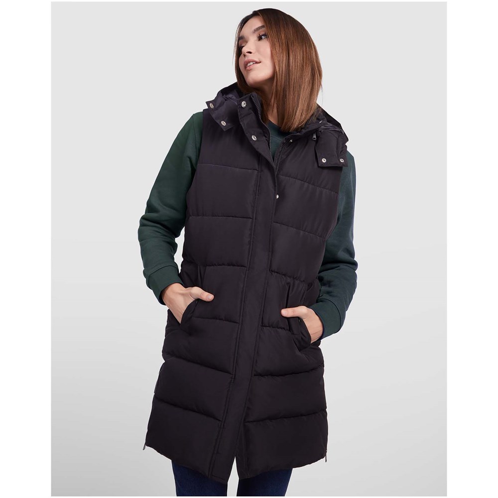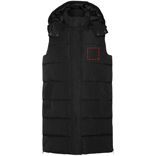 Wattierte Weste mit abnehmbarer Kapuze. Hoher Kragen. Reißverschluss auf der Vorderseite, verdeckt durch eine Patte. Zwei Taschen mit Druckknopfverschluss. Seitliche Öffnungen mit Reißverschlüssen. Zugang zur Brust von der Innenseite. Wasserabweisend.
