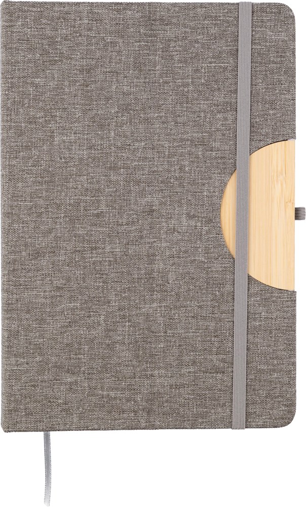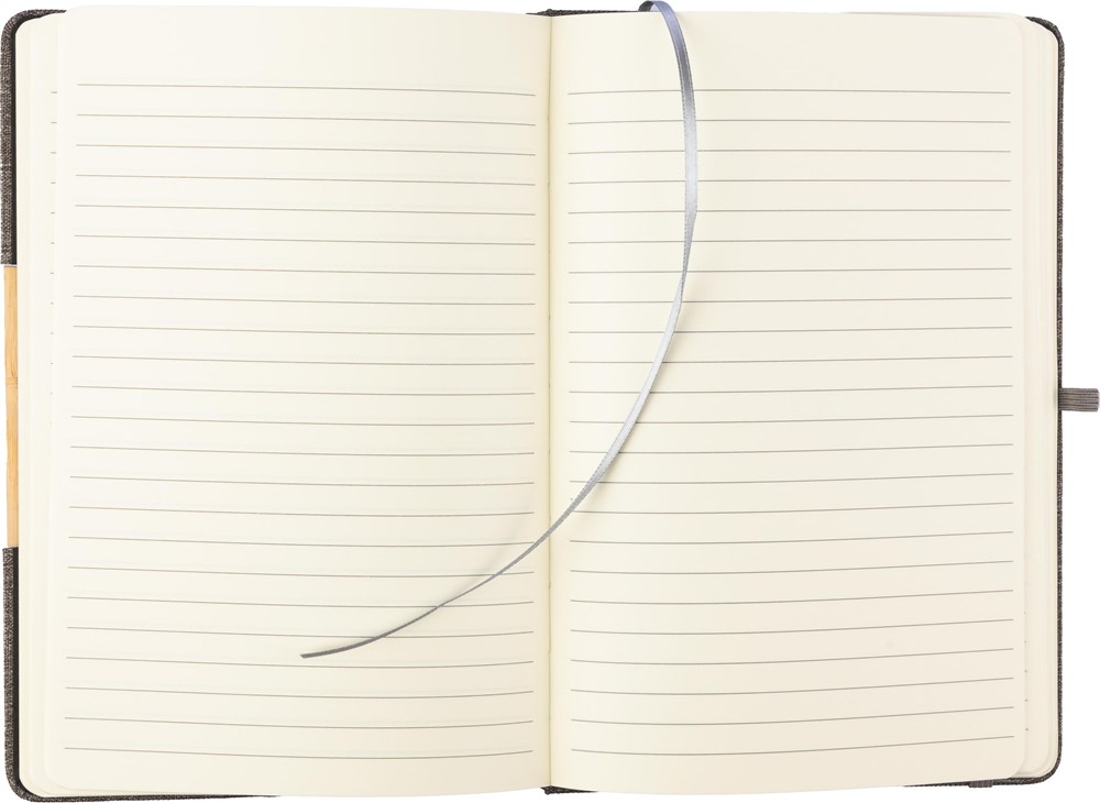 rPET (300D) Notizbuch (ca. A5) mit 80 linierten Seiten. Die faltbare Hülle verwandelt sich in einen Telefonhalter mit Bambusdetail auf der Abdeckung.
