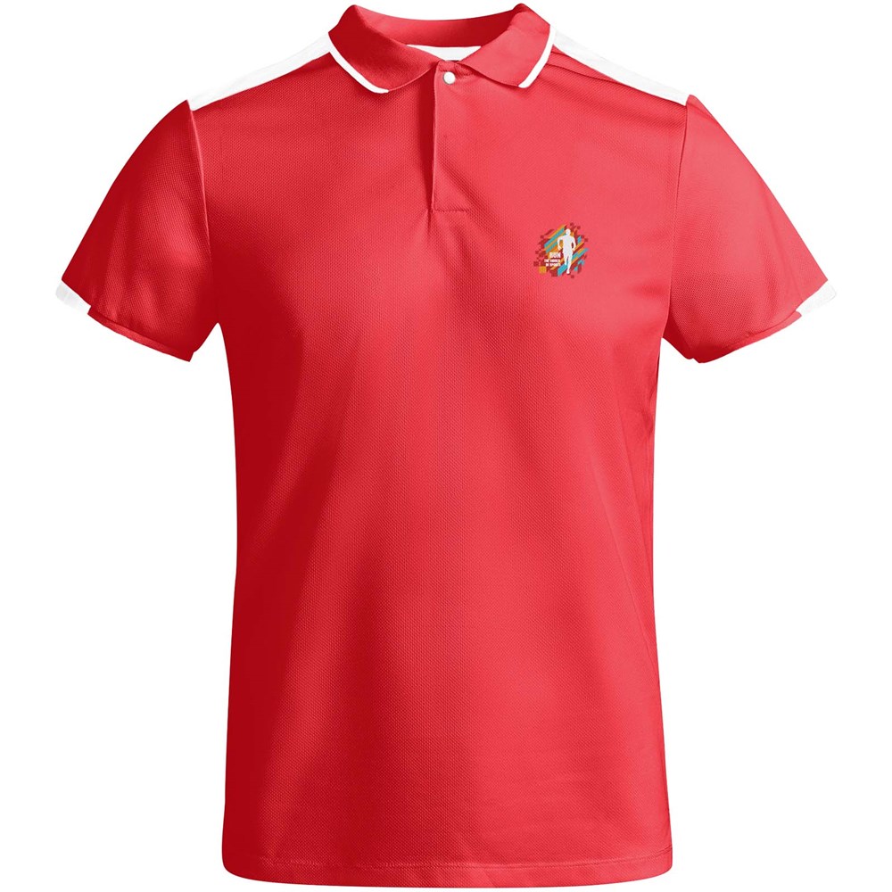 Antibakterieller Stoff aus recyceltem Polyester. 1x1-Rippstrick am Kragen und Details an den Ärmeln. Verstärkte, verdeckte Nähte am Kragen. Knopfleiste mit 2 verdeckten Druckknöpfen. Details und Schulterpartien in Kontrastfarbe. Seitenschlitze am Saum. Abnehmbares Etikett.
