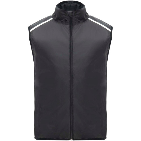 Leichte Funktions - Laufweste, winddicht und atmungsaktiv. Frontreißverschluss mit passendem Kinnschutz. Elastische Einfassung am Armausschnitt und Saum. Untere Rückenpartie aus mikroperforiertem Stoff. Reflektierende Details auf den Schultern, Front- und Rückseite. Tasche mit elastischem Band zum Verstauen der Weste und zum Tragen am Handgelenk. Abnehmbares Etikett.