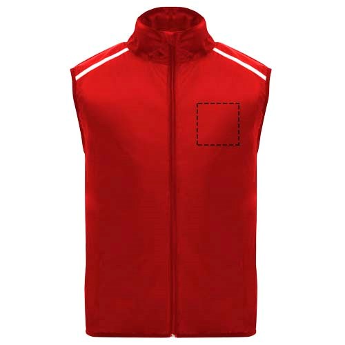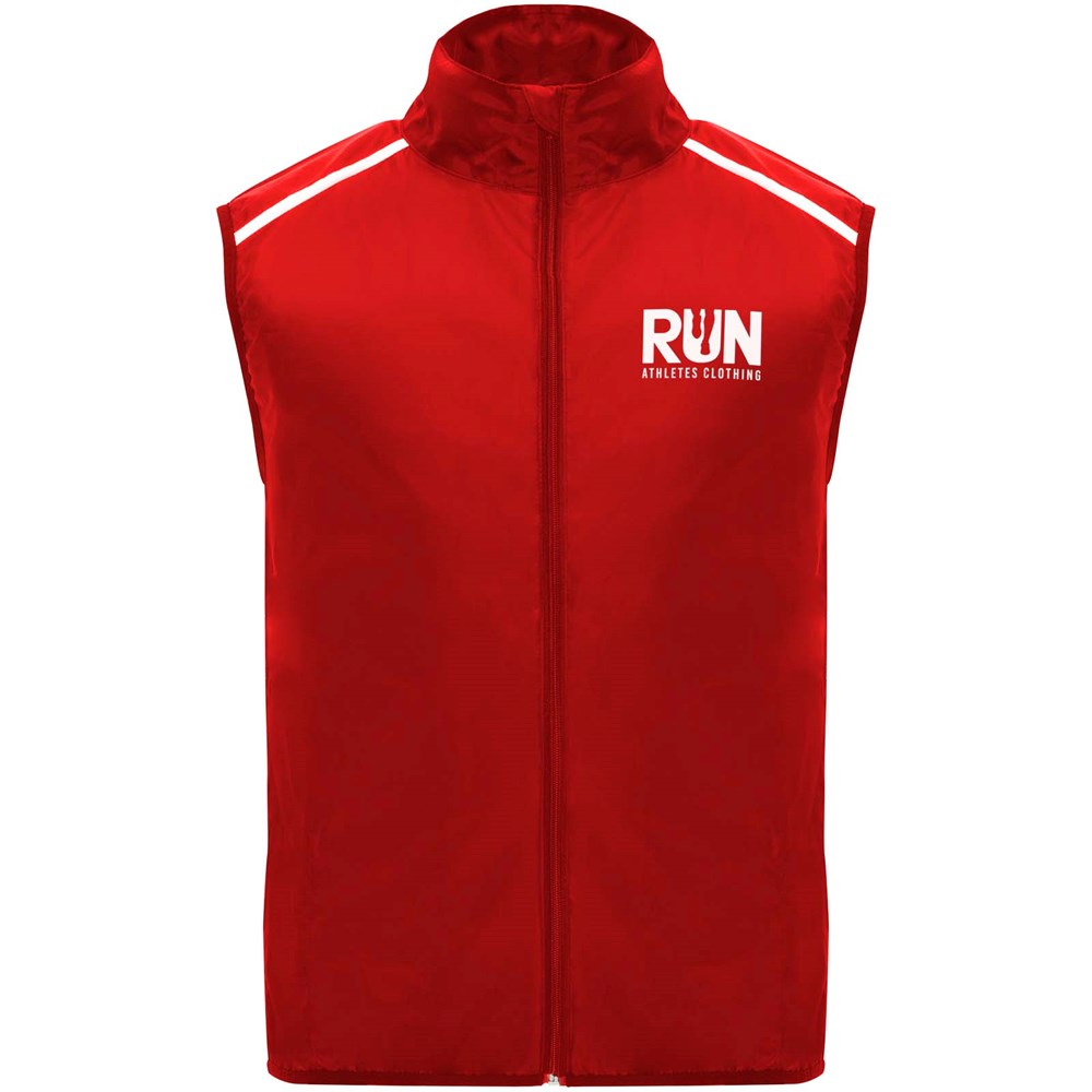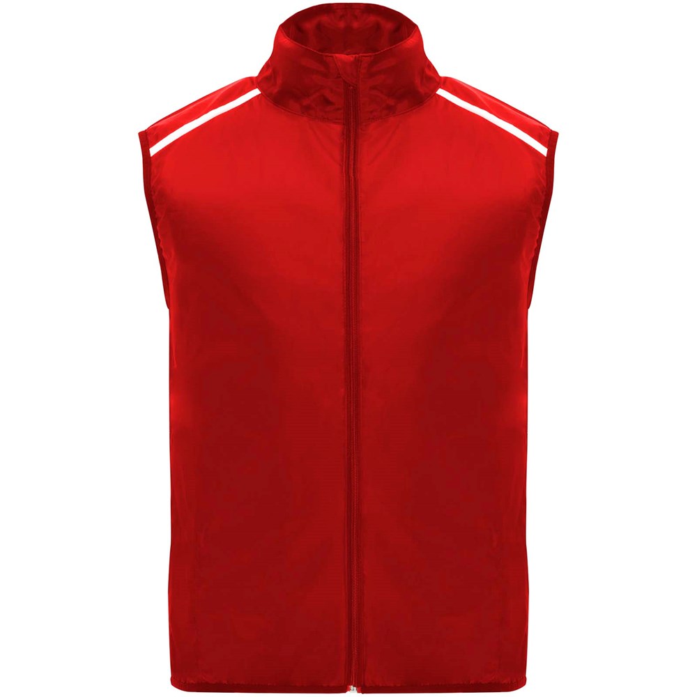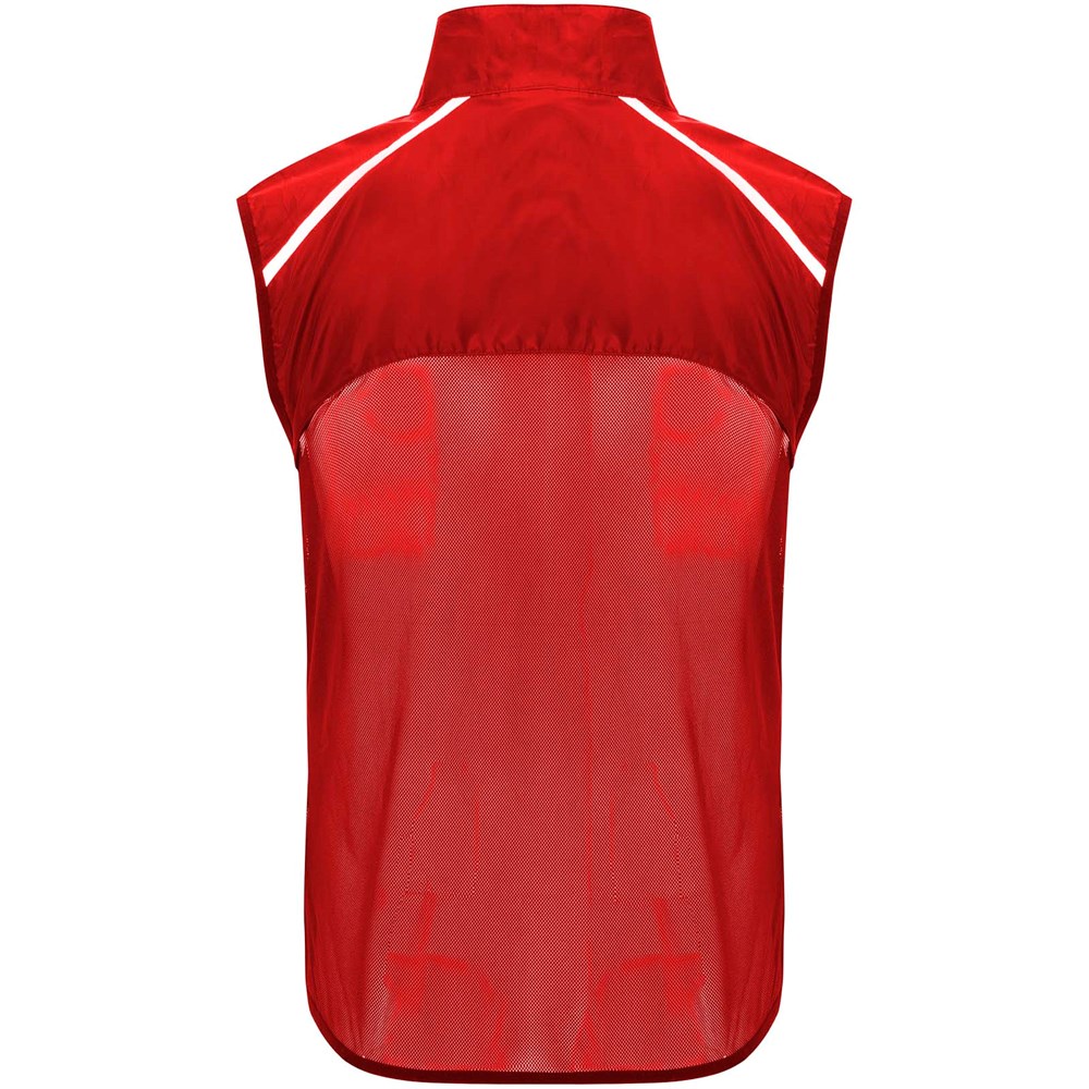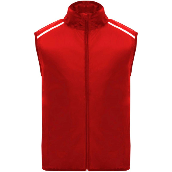 Leichte Funktions - Laufweste, winddicht und atmungsaktiv. Frontreißverschluss mit passendem Kinnschutz. Elastische Einfassung am Armausschnitt und Saum. Untere Rückenpartie aus mikroperforiertem Stoff. Reflektierende Details auf den Schultern, Front- und Rückseite. Tasche mit elastischem Band zum Verstauen der Weste und zum Tragen am Handgelenk. Abnehmbares Etikett.