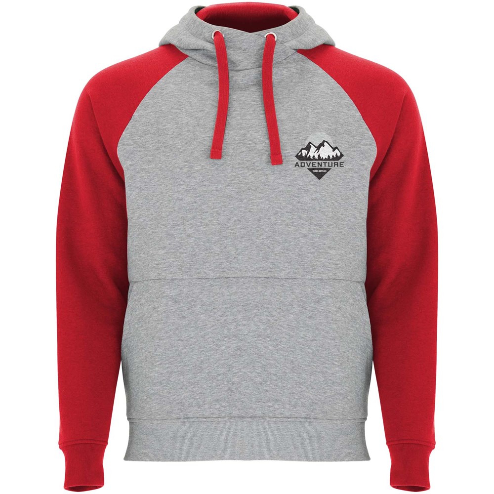Zweifarbiger Unisex Kapuzenpulli. Kapuze mit gekreuztem Kragen und Metallösen. Innenkapuze, Kordelzug und Raglanärmel in Kontrastfarbe. Kängurutasche. Bündchen und Saum aus elastischem 1×1-Rippstrick. Abnehmbares Etikett.