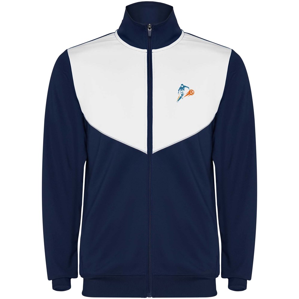 Trainingsanzug aus leichtem und elastischem Stoff. Jacke mit farblich abgesetzten Nähten im Brustbereich. Hoher Kragen mit Kontrastnähten. Zentraler Frontreißverschluss. Seitentaschen. 2x2-Rippenbündchen an Ärmeln und Bund. Hose mit elastischem Bund und Kordelzug. Seitliche Kontrasteinsätze mit Steppnaht. Beinsaum mit Reißverschluss.