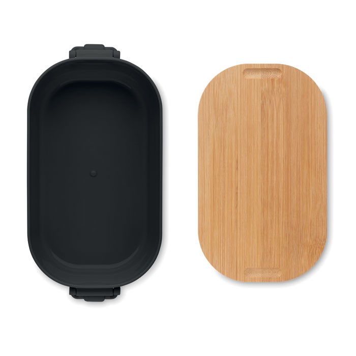 Lunchbox aus PP mit Deckel aus Bambus. 2 seitliche Halteklammern. Füllmenge: 700 ml.