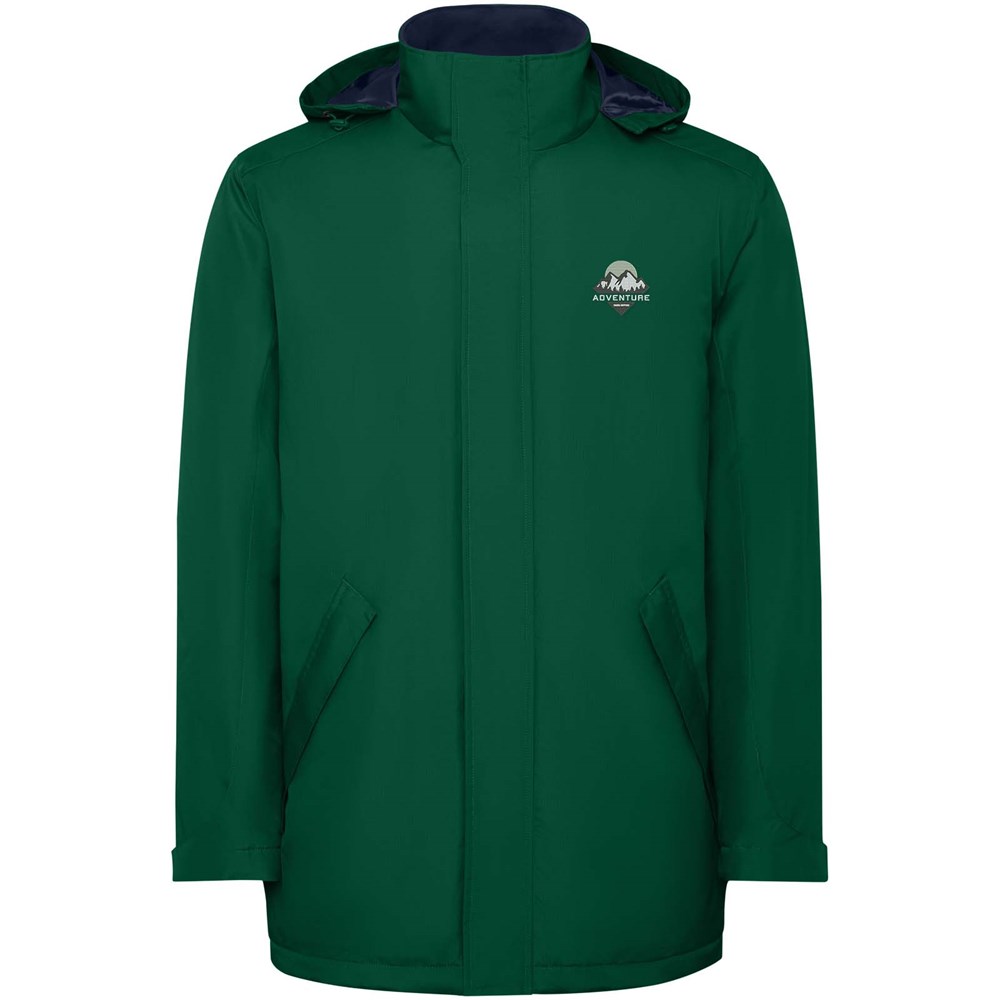 Wasserabweisende, wattierte Parkajacke für Herren. Hoher Kragen mit einrollbarer und abnehmbarer Kapuze mit Klettverschluss. Mittig durchgehender Reißverschluss mit Patte. Seitentaschen mit Reißverschluss und fester Patte. Innentasche mit Klettverschluss. Verstellbare Ärmelbündchen mit Klettverschluss. Verstärkungen im Rücken und auf der linken Brust.