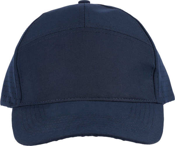 Mütze aus Polyester mit gelaserten Luftlöchern auf der Rückseite. Ausgestattet mit einem 7-Panel-Design mit Frontpanel und 7 cm Schild. Verstellbar, atmungsaktiv, ohne PU-Etikett.