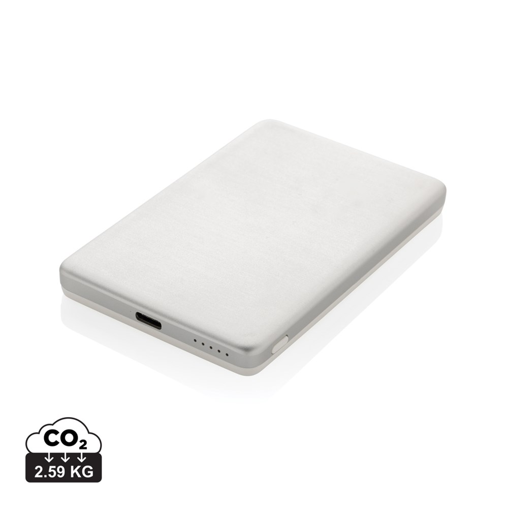 Ultradünne 5.000mAh Powerbank mit magnetischem, kabellosem 5W-Ladegerät, bei der das Gehäuse aus RCS-zertifiziert recyceltem Aluminium und recyceltem ABS-Kunststoff hergestellt ist. RCS (Recycled Claim Standard) ist ein Standard zur Überprüfung des Recyclinganteils eines Produkts über die gesamte Lieferkette hinweg. Recycelter Gesamtanteil: 23%, bezogen auf das Gesamtgewicht des Artikels. Die Powerbank enthält einen langlebigen 5.000mAh-A-Grade Lithium-Polymer-Akku. Die Ladestandsanzeige zeigt den verbleibenden Energiestand an, damit Sie immer wissen, wann Sie wieder aufladen müssen. Type-C-Input: 5V/2,4A; USB-C-Output: 5V/2A.4A. Artikel und Zubehör sind PVC-frei. Inklusive RCS-zertifiziert recyceltem TPE-Ladekabel. Verpackt in FSC®-Mix-Verpackung.