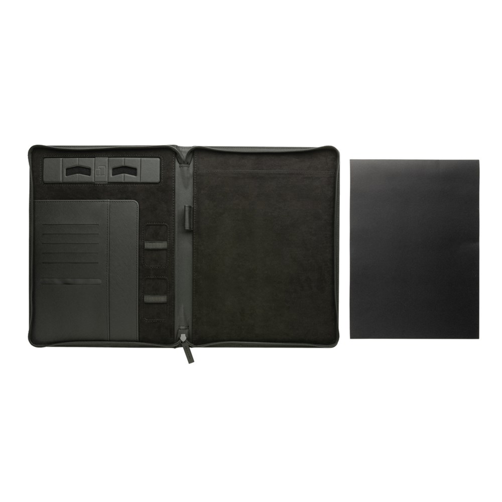 Die Swiss Peak Heritage Kollektion spricht die Sprache moderner Eleganz. Das Portfolio mit recyceltem PU-Cover und Reißverschluss hat einen Tablet-/Telefonständer, Visitenkartenfächer, sowie Fächer für Ihre Notizen und Papiere und noch eine Stiftschlaufe. Mit liniertem 20-Blatt-A4-Steinpapier-Notizblock. wird aus RCS (Recycled Claim Standard)-zertifiziert recycelten Materialien hergestellt. Die RCS-Zertifizierung gewährleistet eine vollständig zertifizierte Lieferkette der recycelten Materialien. Hergestellt aus RCS-zertifiziertem, recyceltem PU. Gesamter Recyclinganteil: 9%, bezogen auf das Gesamtgewicht des Artikels. PVC-frei.