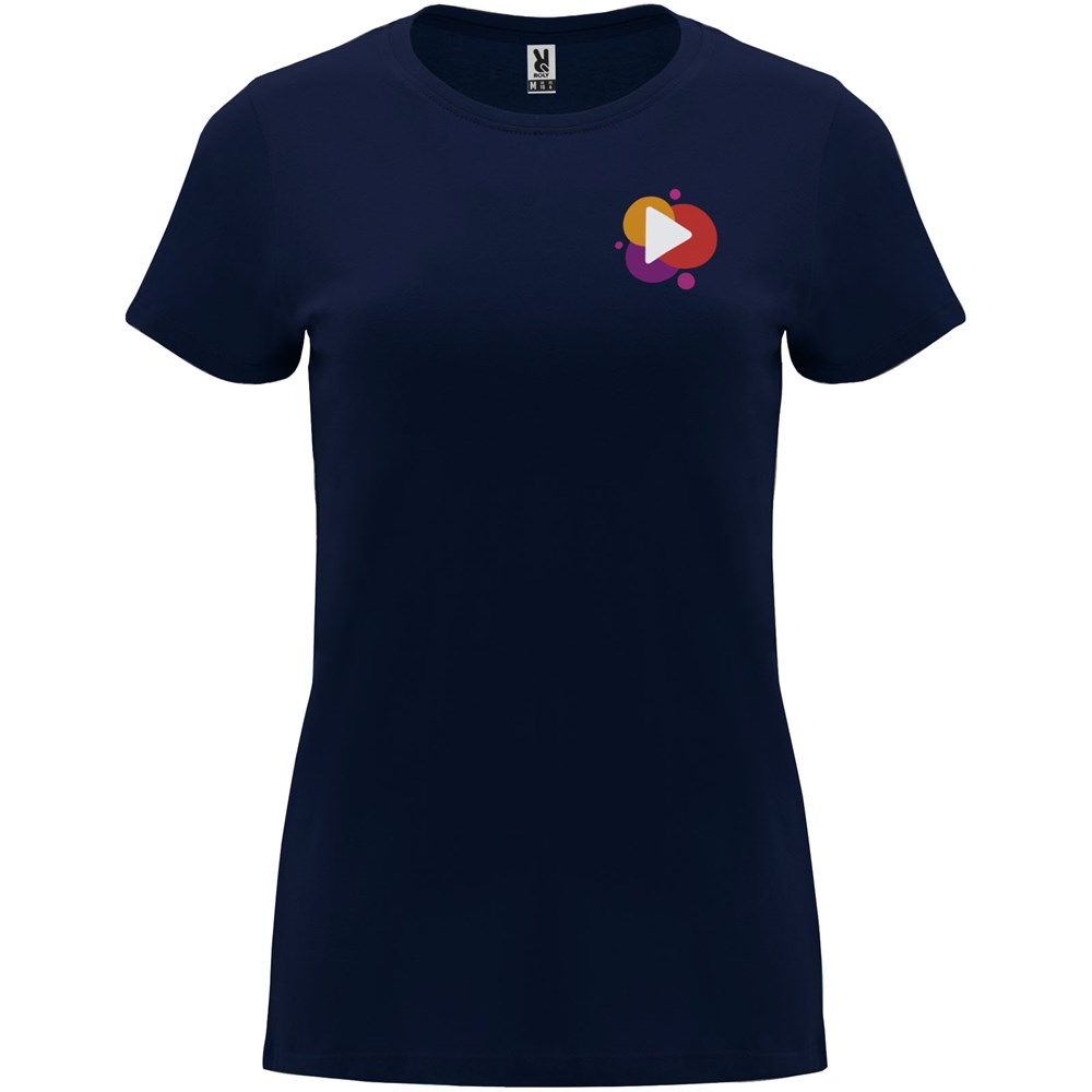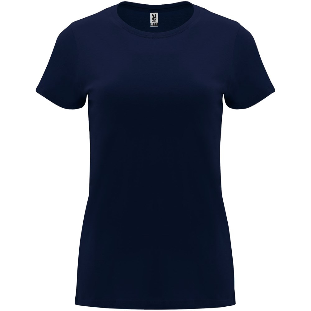 Tailliertes kurzärmeliges T-Shirt für Damen. Rundhalsausschnitt mit 1×1 Rippstrick. Verstärkte und verdeckte Nähte am Kragen. Herausnehmbares Etikett.