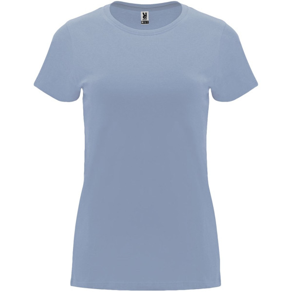 Tailliertes kurzärmeliges T-Shirt für Damen. Rundhalsausschnitt mit 1×1 Rippstrick. Verstärkte und verdeckte Nähte am Kragen. Herausnehmbares Etikett.