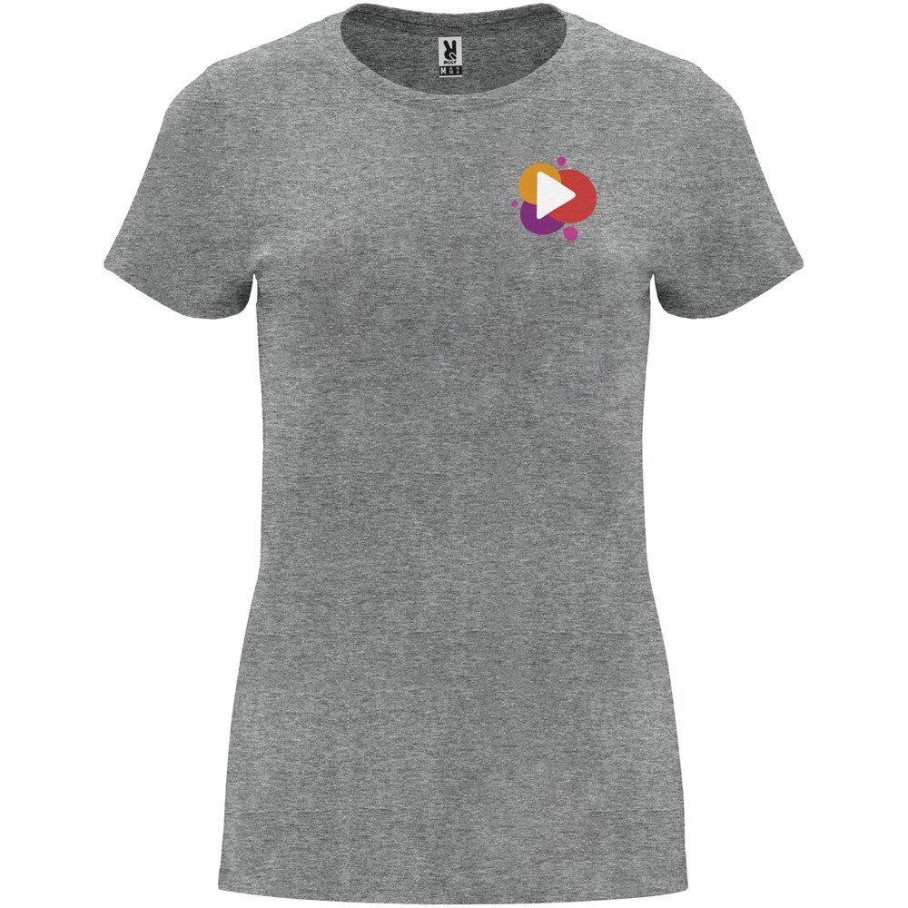 Tailliertes kurzärmeliges T-Shirt für Damen. Rundhalsausschnitt mit 1×1 Rippstrick. Verstärkte und verdeckte Nähte am Kragen. Herausnehmbares Etikett.