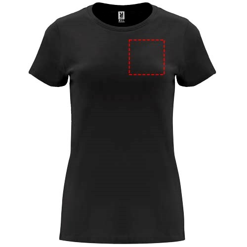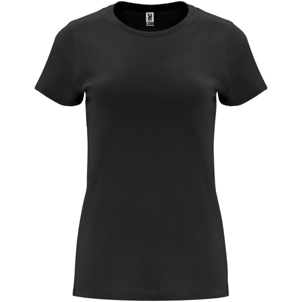 Tailliertes kurzärmeliges T-Shirt für Damen. Rundhalsausschnitt mit 1×1 Rippstrick. Verstärkte und verdeckte Nähte am Kragen. Herausnehmbares Etikett.