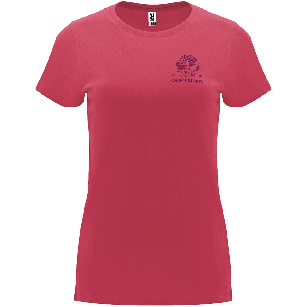 Tailliertes kurzärmeliges T-Shirt für Damen. Rundhalsausschnitt mit 1×1 Rippstrick. Verstärkte und verdeckte Nähte am Kragen. Herausnehmbares Etikett.
