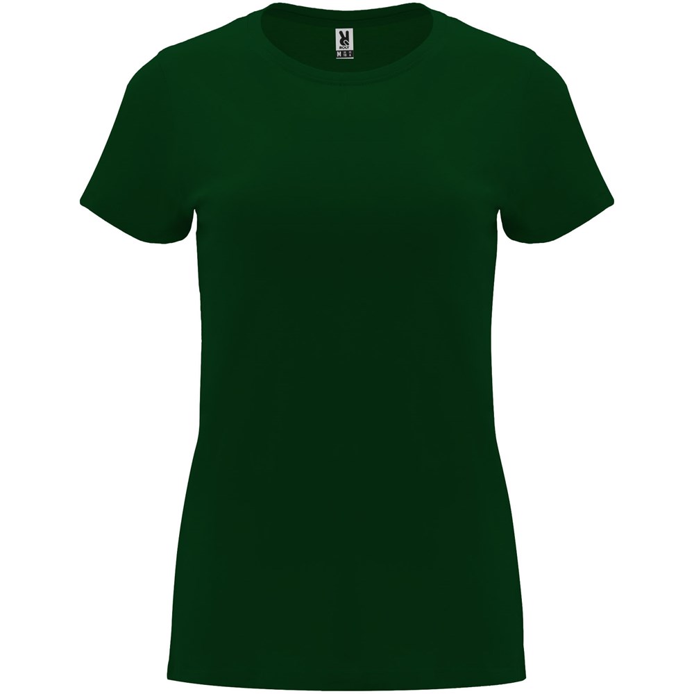 Tailliertes kurzärmeliges T-Shirt für Damen. Rundhalsausschnitt mit 1×1 Rippstrick. Verstärkte und verdeckte Nähte am Kragen. Herausnehmbares Etikett.