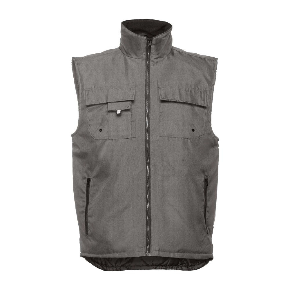 Herren Arbeitsweste aus 100% Polyester mit Acrylbeschichtung (170g/m²), gepolstert und gefuttert. Innenseite aus 100% Polyester-Taft (65g/m²) mit Polar Fleece Kragen. Die Weste hat 6 Taschen, 5 Taschen auf der Vorderseite davon 2 Taschen mit Reißverschluss, 1 Tasche für das Handy und 1 Innentasche. Elastisches Band an den Seiten. Der Reißverschlusszugang auf der Rückseite vereinfacht die Veredelung. Größen: S, M, L, XL, XXL, 3XL