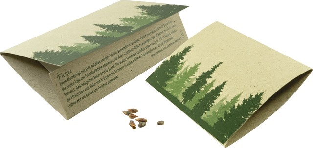 Das trendige Graspapier-Kärtchen mit den Fichten-Samen ist ein natürliches und sympathisches Giveaway in der Weihnachtszeit. Nutzen Sie das Klappkärtchen im Standardmotiv für Ihre Werbebotschaft oder, ebenfalls ab 250 Stück, für Ihre individuelle Gestaltung. Inhalt: Samen: Fichte