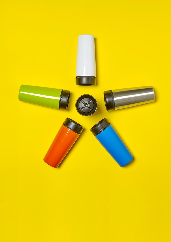 Isolierbecher aus Edelstahl, farbig lackiert, doppelwandig, mit Anti-Rutsch-Matte auf der Unterseite, Kunststoff-Deckel und Schnellverschluss, Inhalt ca. 450 ml.