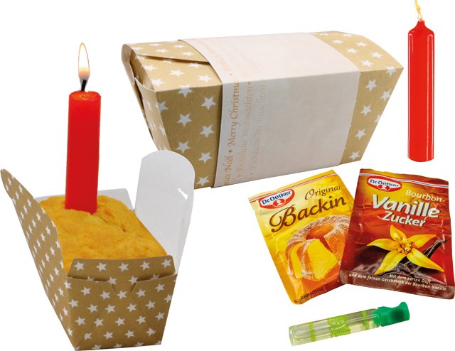 Inhalt: Kerze (ca. 70 mm), Vanillezucker, Backpulver, Zitronenaroma, Rezept auf der Banderole (ohne Gebäck)
