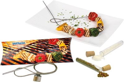Unsere BBQ-Box enthält Grillkräuter und Meersalz für die deftige Zubereitung von Speisen. Speziell zum Grillen oder Braten in der Pfanne ist ein Grilldraht enthalten, auf dem sich leicht Fleisch oder Gemüse aufspießen lassen und der nach dem Gebrauch wiederverwendbar ist. Alles ist schön und handlich verpackt in der Geschenk-Box. Platz für den Werbedruck ist auf dem Standardmotiv der Packung oder eine eigene Gestaltung der Packung, jeweils bereits ab 250 Stück. Inhalt: Grilldraht, Röhrchen mit ca. 15 g Meersalz, Röhrchen, ca. 5 g Grillkräuter